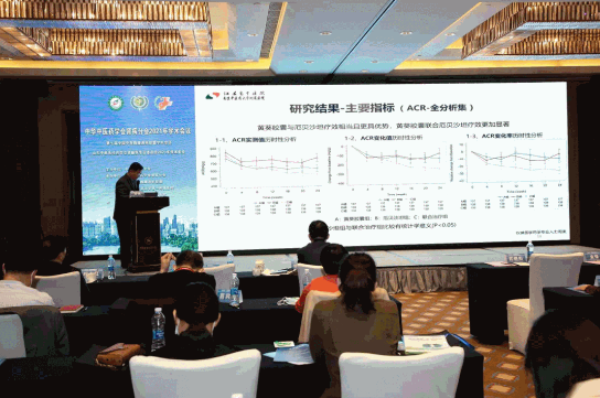 在主会场现场,由中华中医药学会肾病分会主任委员杨洪涛教授主持,中华中医药学会肾病分会名誉副主任委员、江苏省中医院首席科学家孙伟教授发布了《黄葵胶囊治疗2型糖尿病肾脏疾病(DKD)的随机、双盲、平行对照、多中心临床试验》的最新成果–黄葵胶囊与厄贝沙坦疗效相当且更具优势,且黄葵胶囊与厄贝沙坦合并用药疗效更加显著!该项目以一线推荐用药厄贝沙坦作为对照药,以T2DKD患者的尿白蛋白/肌酐比值、24小时尿蛋白等指标为疗效指标,观察期24周。纳入患者413例,分黄葵胶囊组、厄贝沙坦组和黄葵胶囊联合厄贝沙坦组三组。研究结果显示,黄葵胶囊组尿蛋白下降的结果比厄贝沙坦组更明显,黄葵胶囊联合厄贝沙坦组下降结果最为明显。孙伟教授表示取得这样研究结果,增强了对中医药研究和发展的信心和力量!