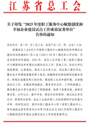 近日,江苏省总工会正式发布2023年度职工服务中心赋能创优和幸福企业建设试点工作成效显著单位名单,EMC易倍集团股份有限公司获评江苏省幸福企业建设试点工作成效显著单位。