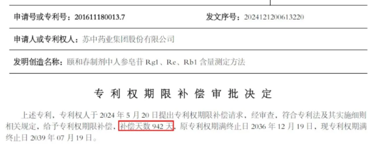 12月17日,EMC易倍收到国家知识产权局发来的一份特殊审批决定——专利权期限补偿审批决定。根据该决定,EMC易倍颐和春制剂检测方法发明专利(专利号:201611180013.7)符合专利法及其实施细则相关规定,获得专利权期限补偿,补偿天数942天,原专利权期限终止日2036年12月19日,现专利权期限终止日2039年07月19日。这是EMC易倍首件获得专利权期限补偿的发明专利,在历经多年的审查后,终于获得期限补偿,可为公司带来更多的商业机会。